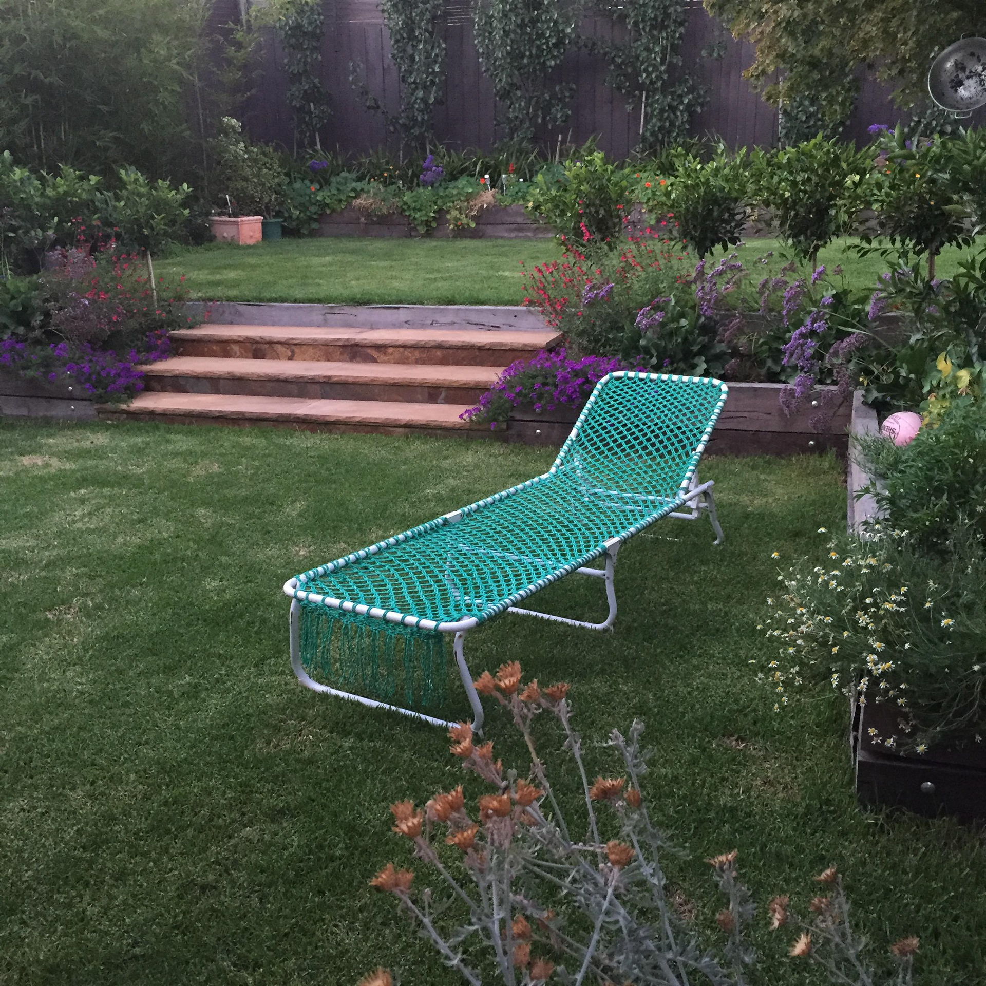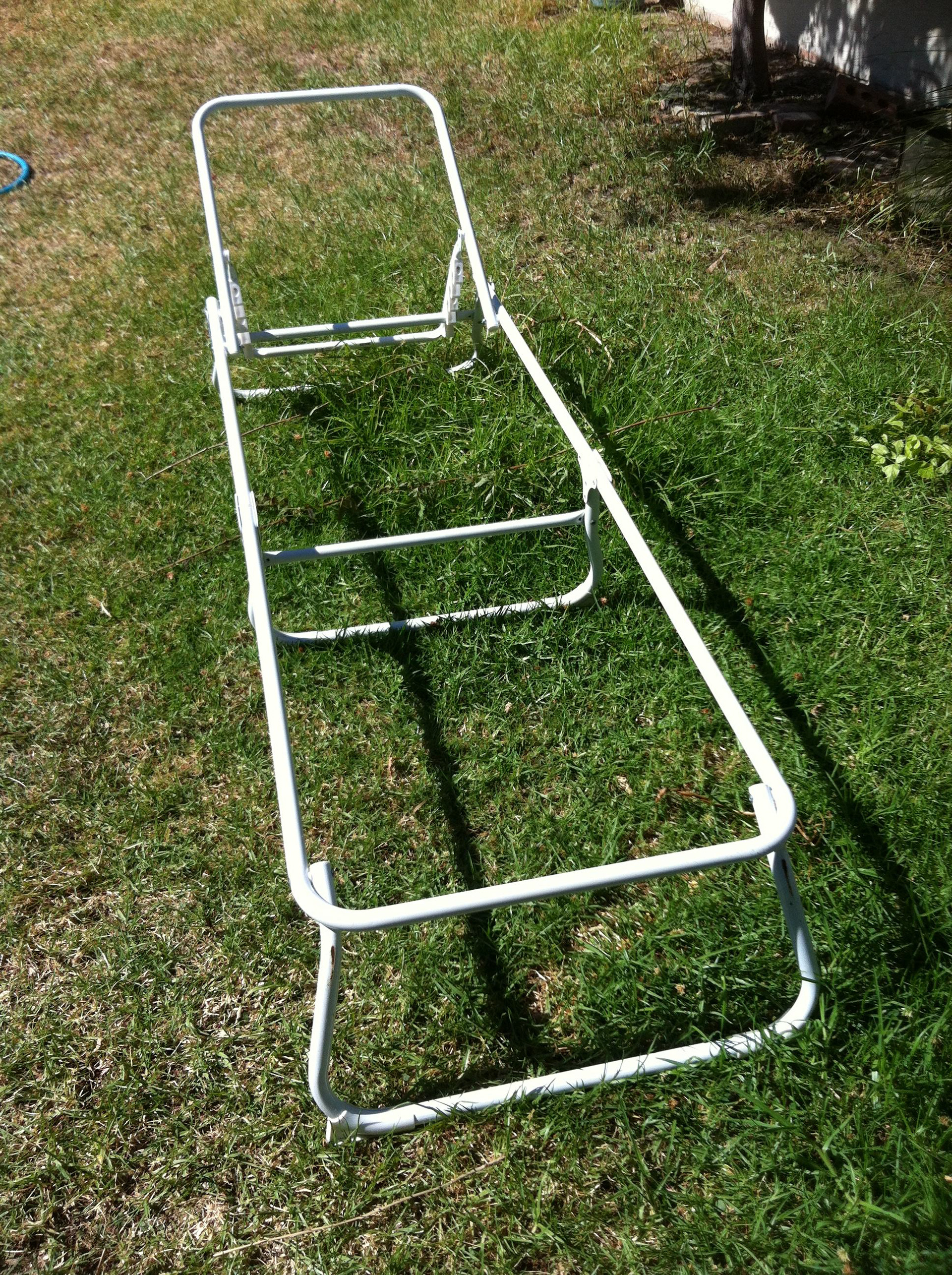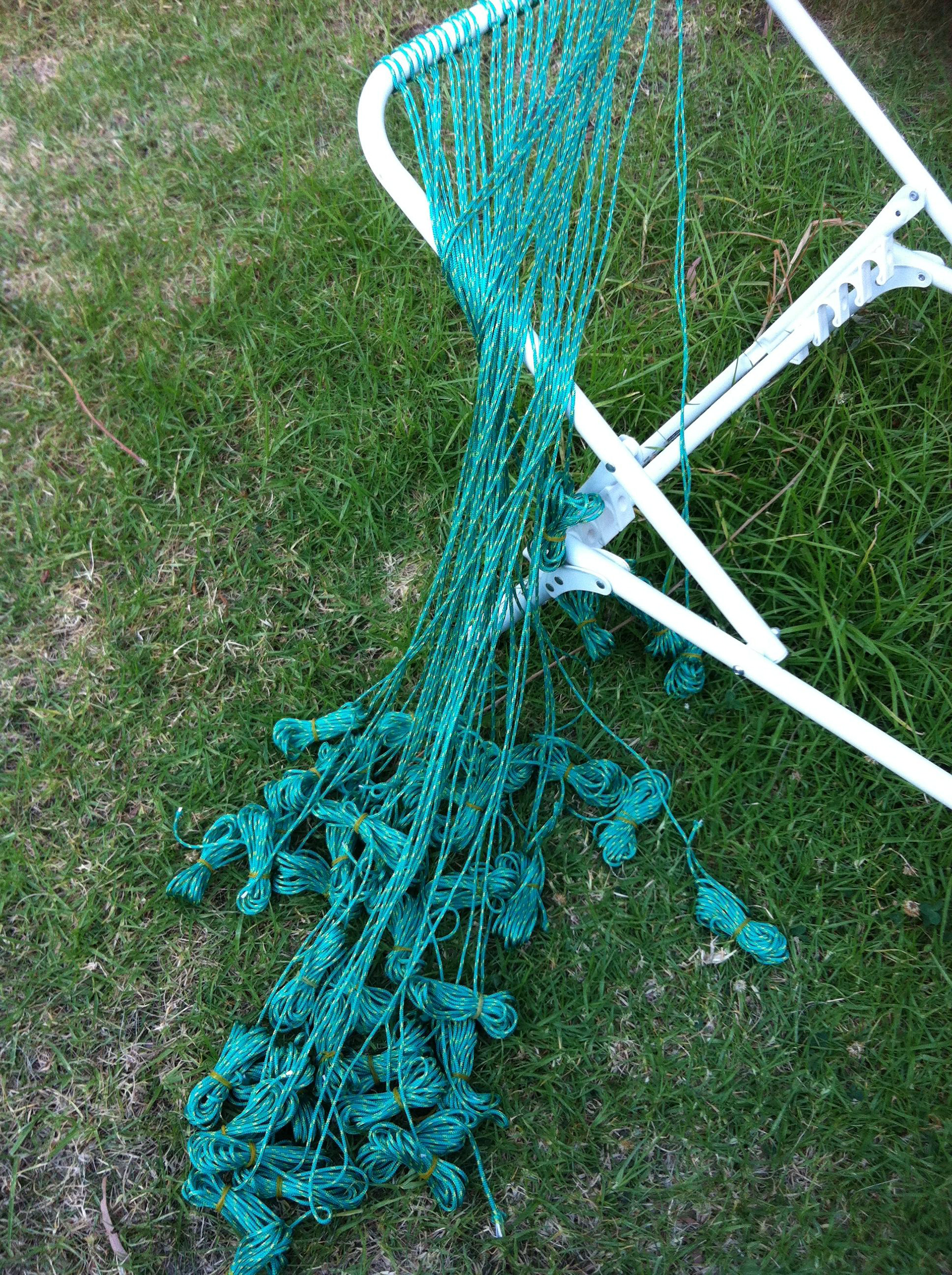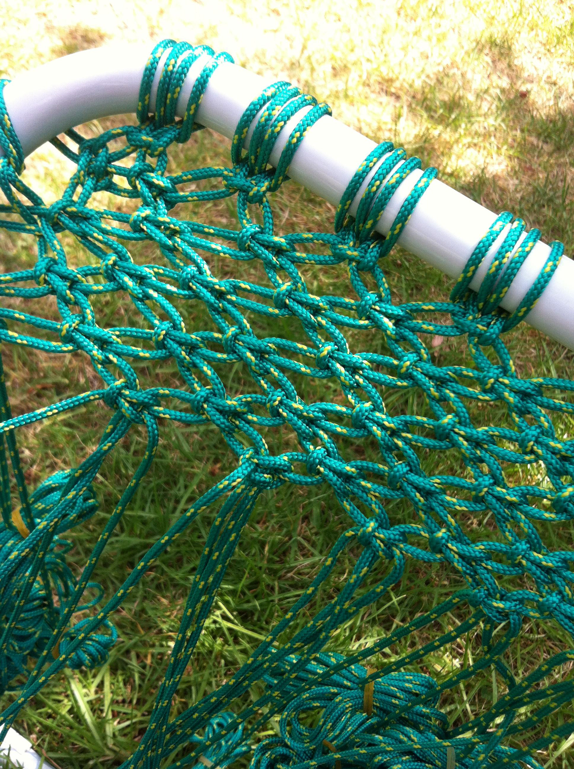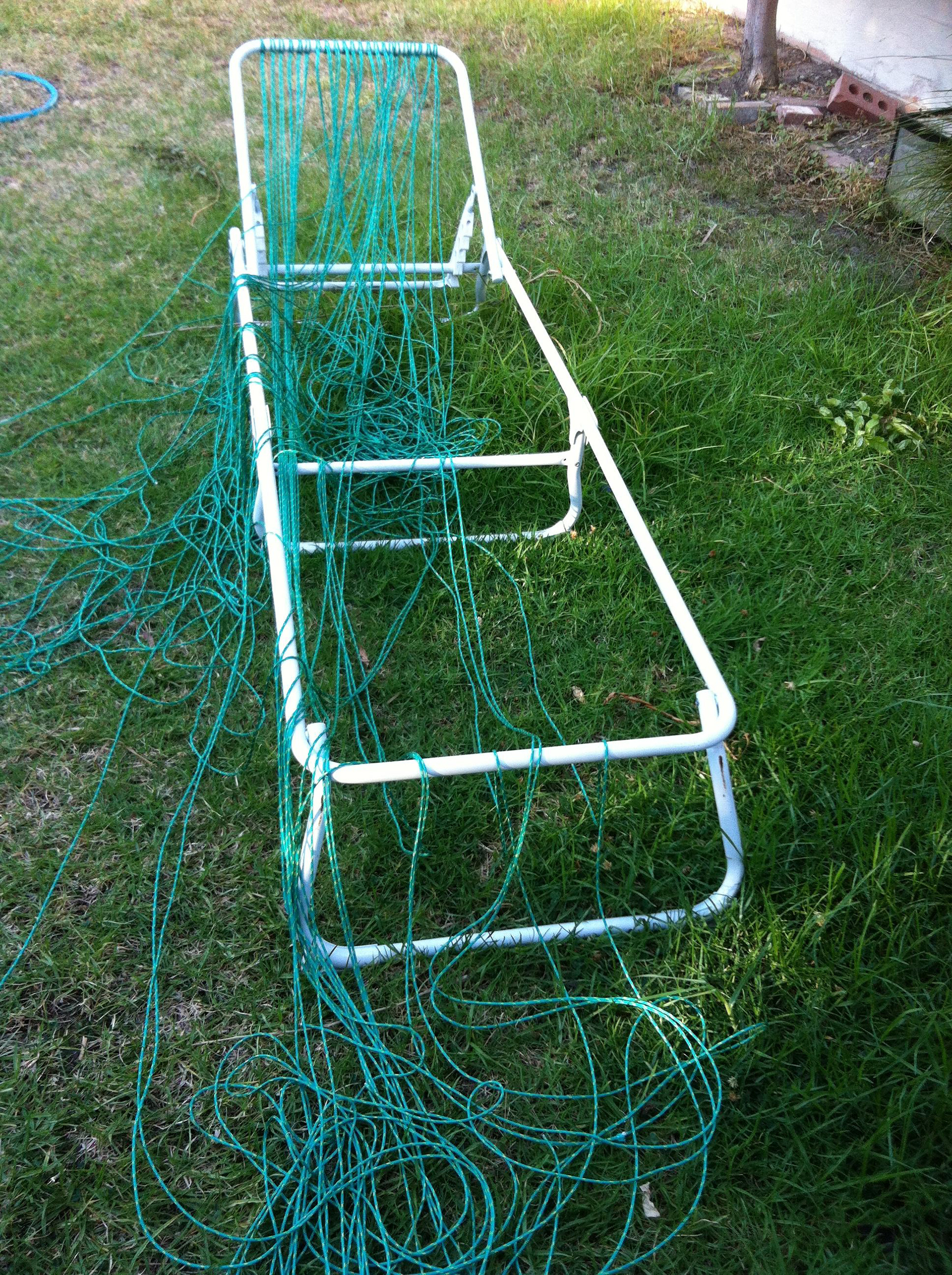 Upcycling of sun lounger frame whereby the original fabric had rotted with excess sunlight. Using macrame and synthetic cording I've knotted a new chair pad which is still defies the weather and show no sign of rot.