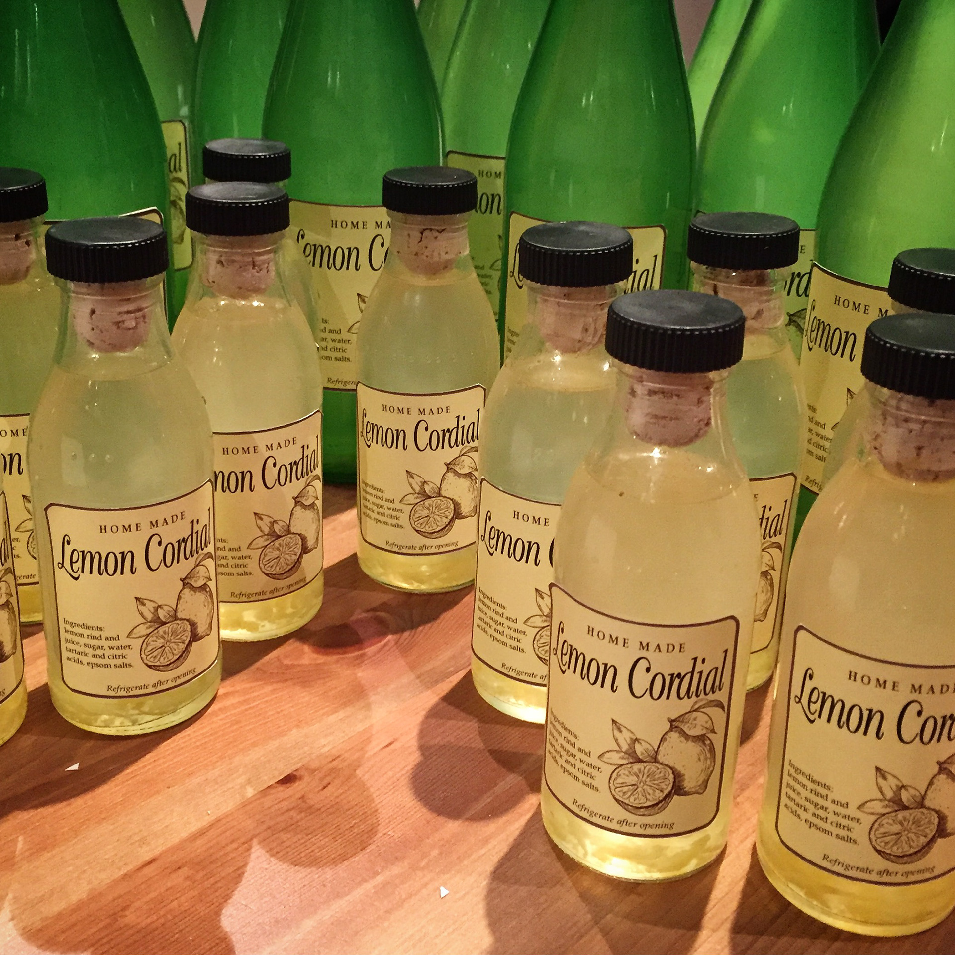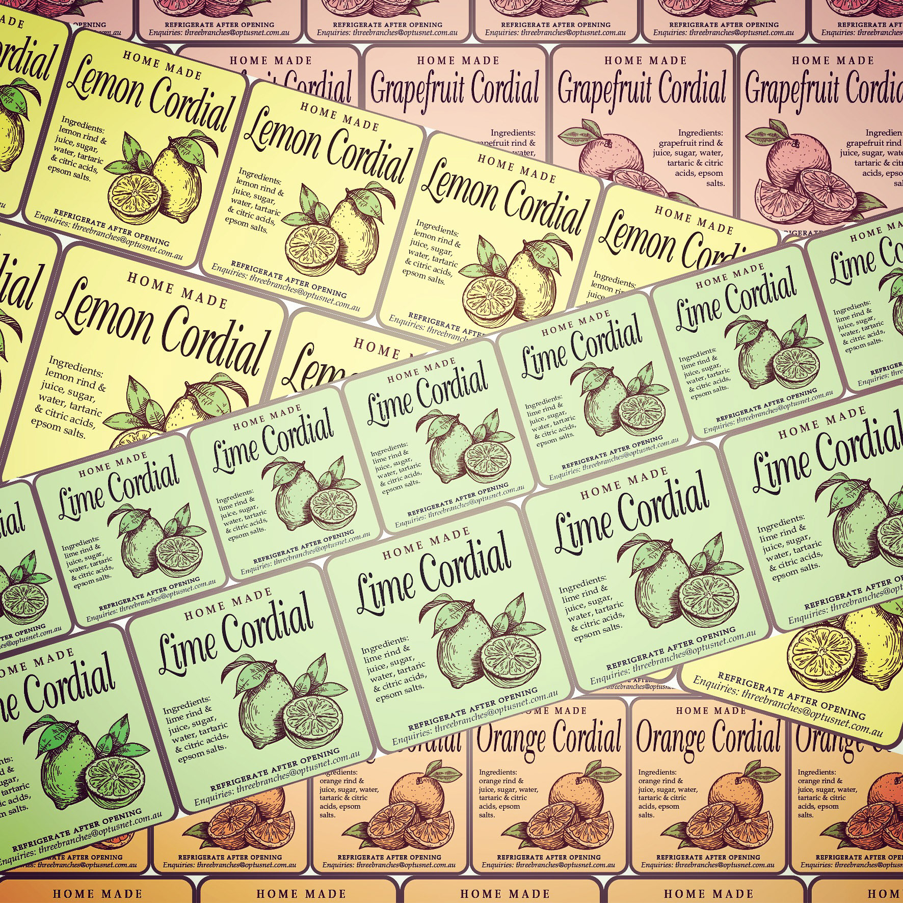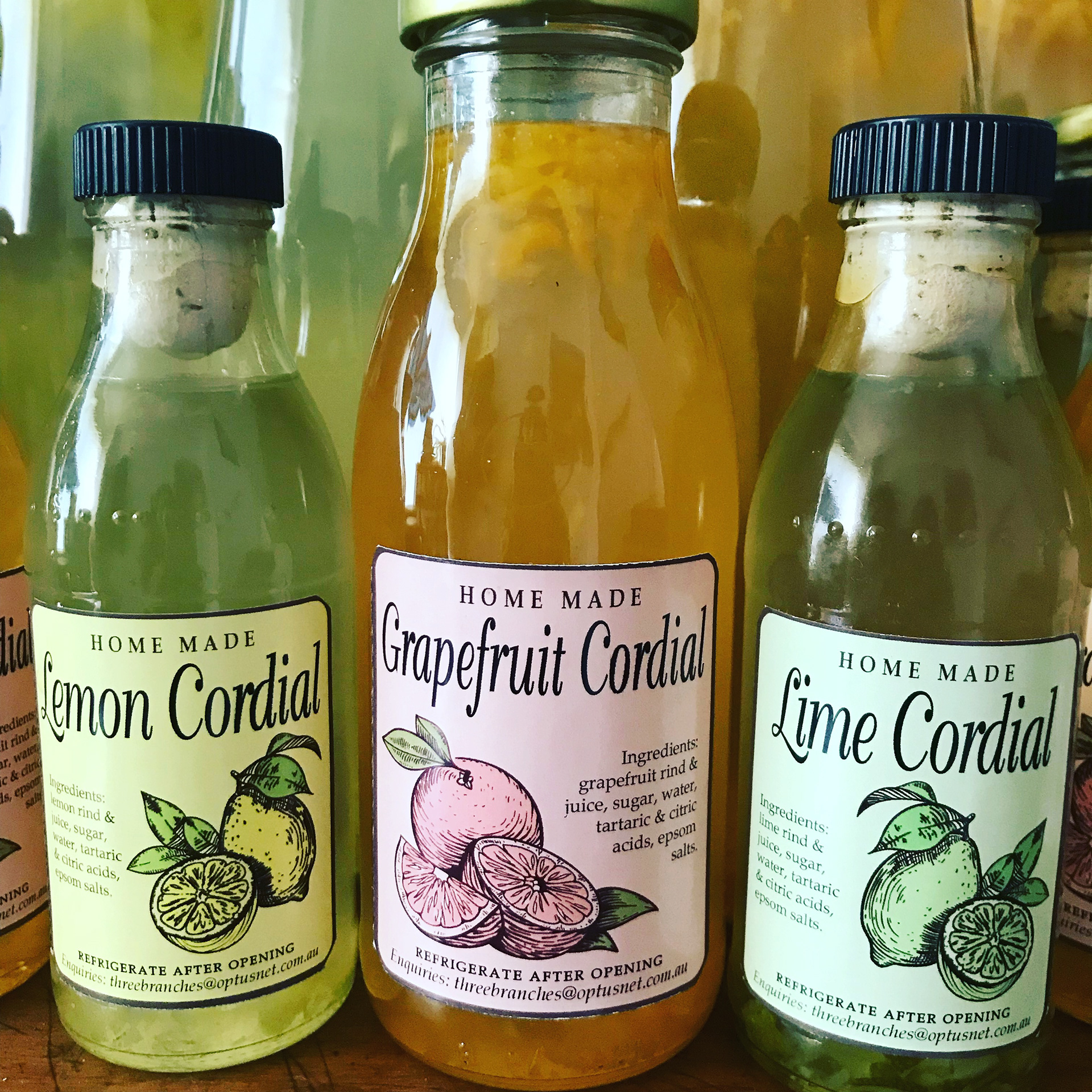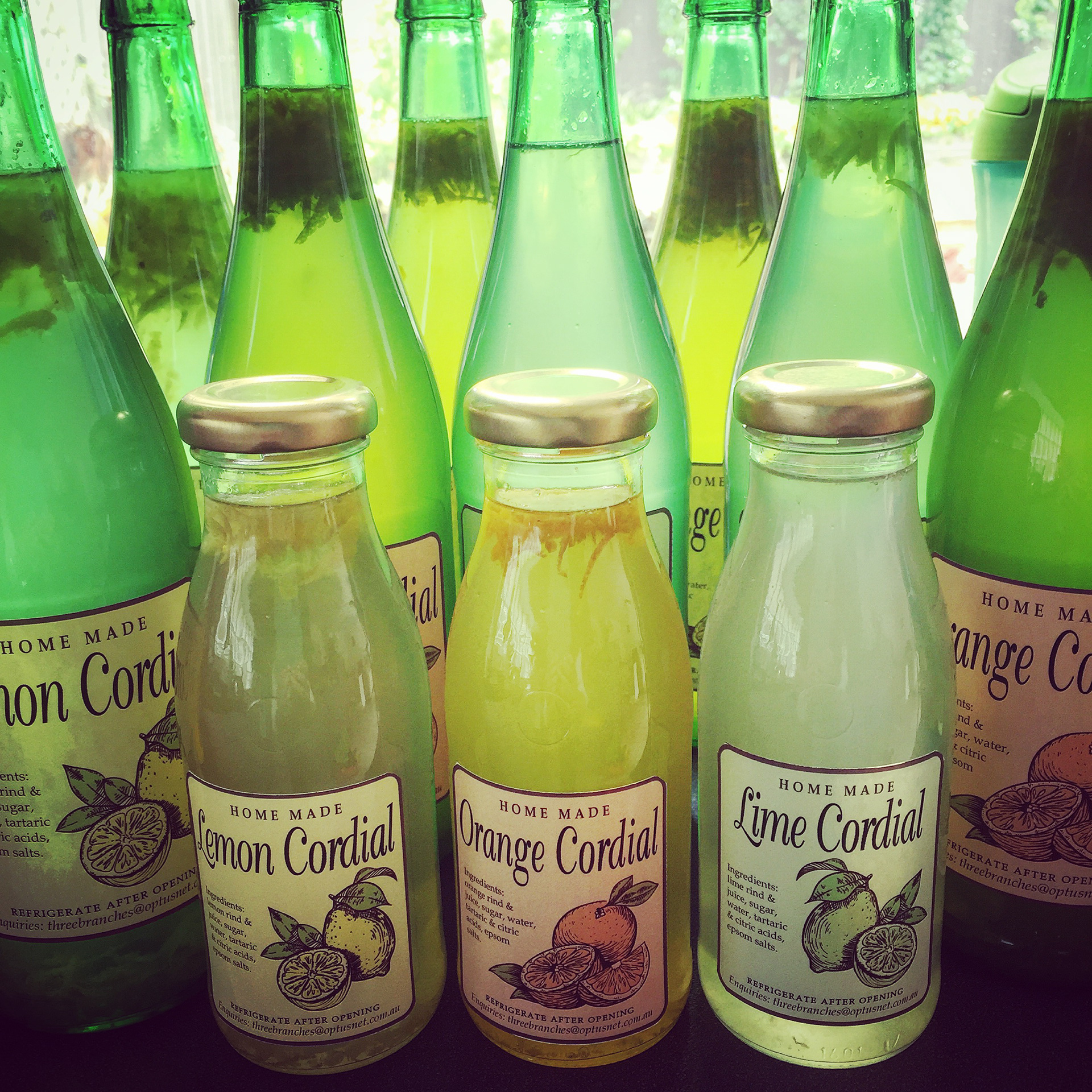When the local citrus trees are laden I turn to the kitchen and brew up some home made cordials. I've created the packaging and sell at local markets and school fetes.