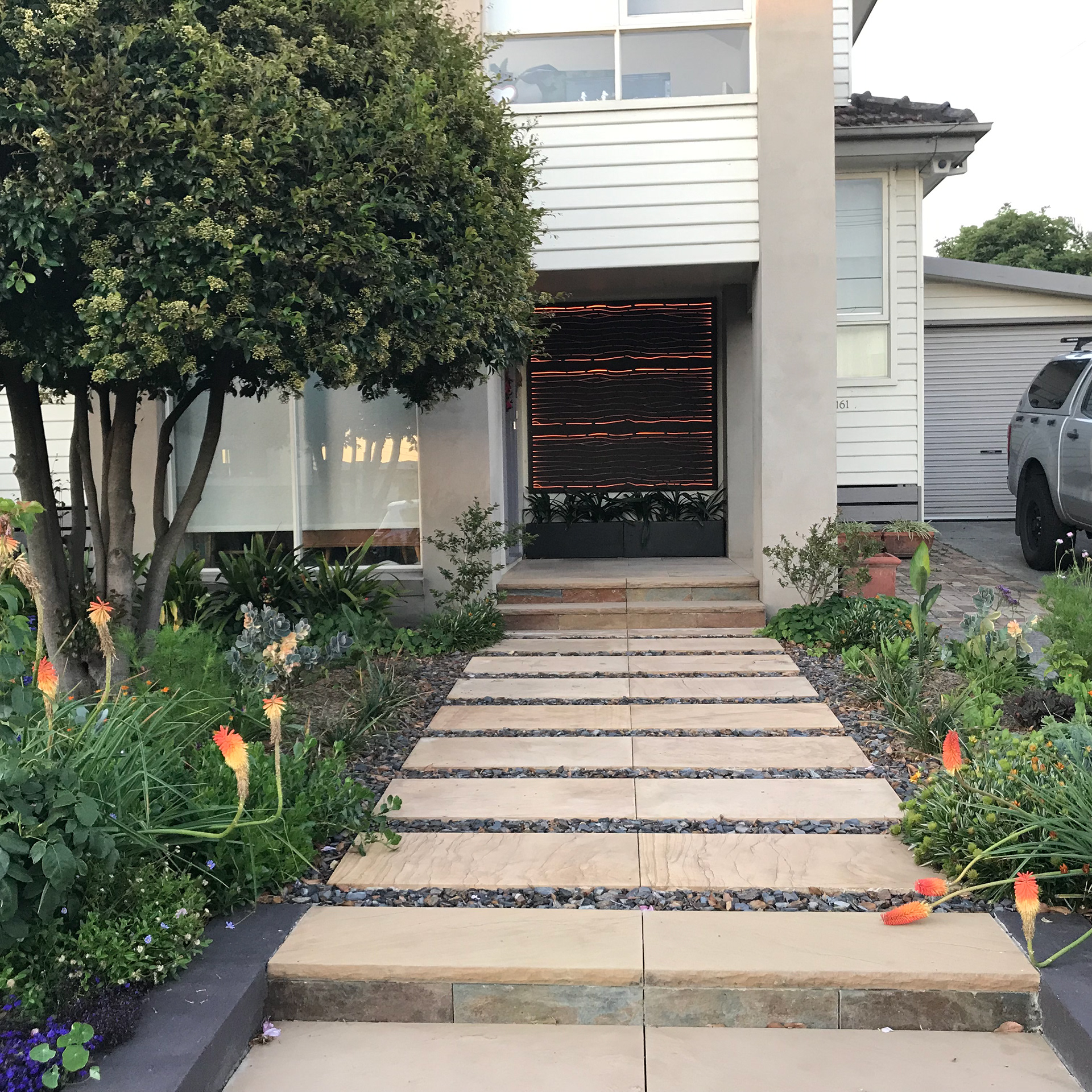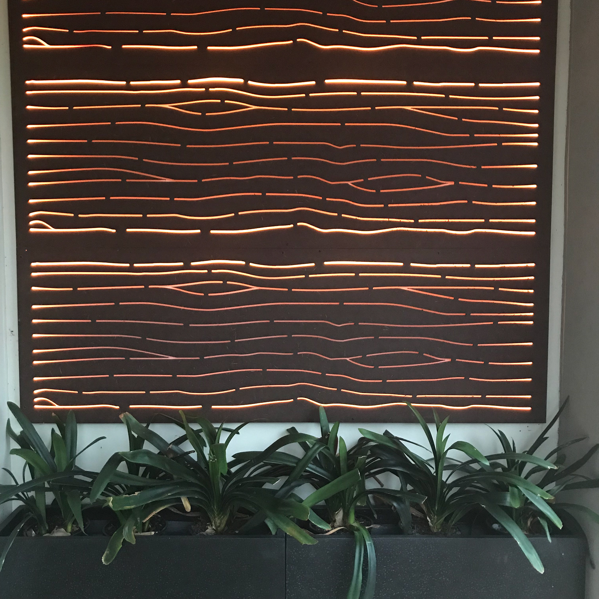 Design and project management of permanent wall lighting feature. This project incorporated use of existing 'Art Deco' wall panels with colour changing led strip lighting to be used as a porch light. The wall feature had to work both during day and at night time, with lights on and off.