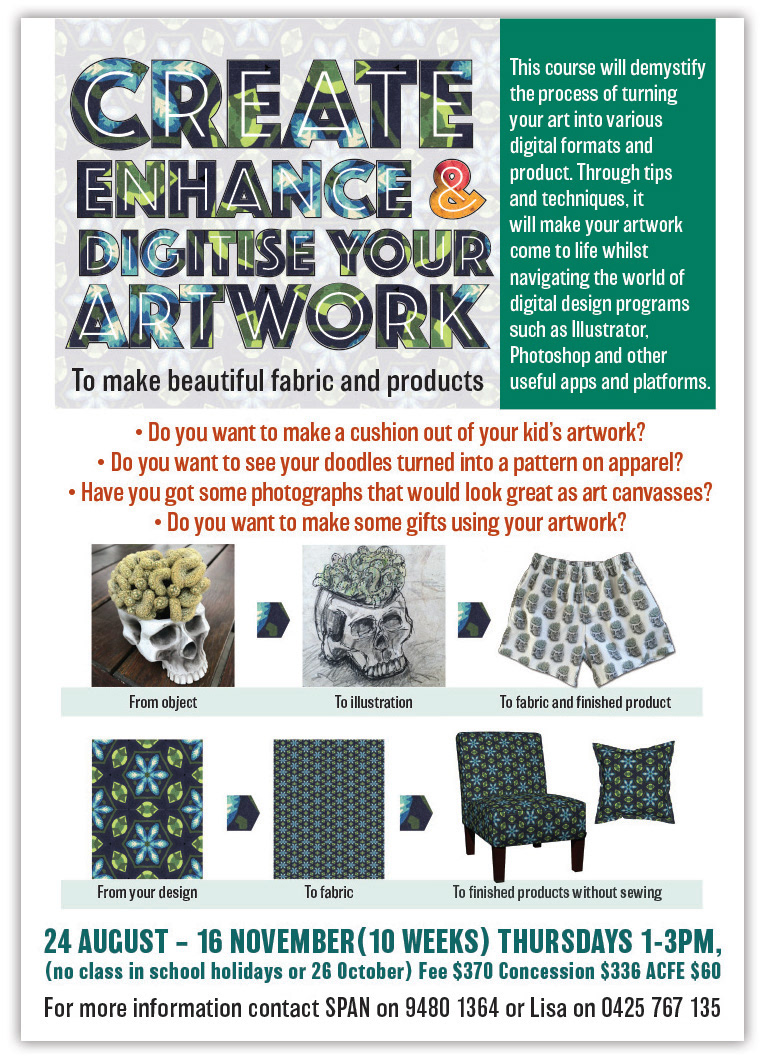 Poster that promoted a course that I ran as part of SPAN Thornbury's digital literacy program - Create, Enhance and Digitise your artwork. Participants learnt how to use Adobe Creative Cloud, apps and web platforms to create their own artwork and apply it to fabrics and homewares.