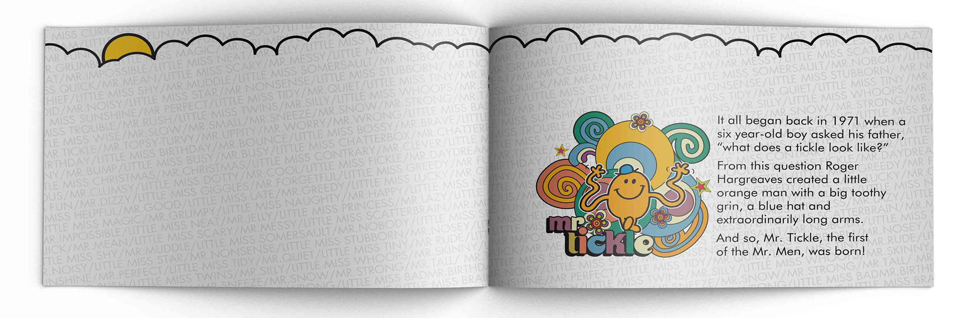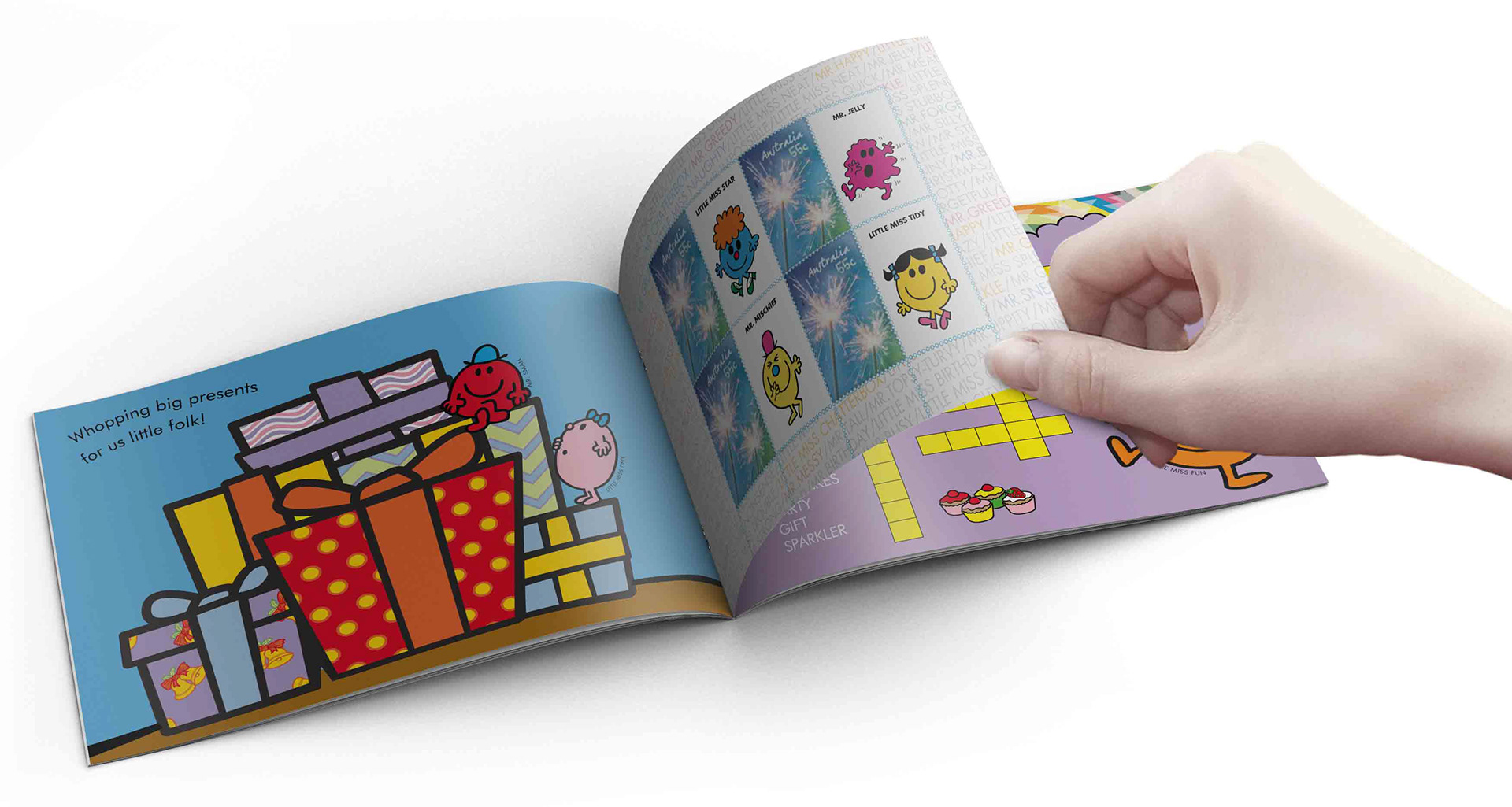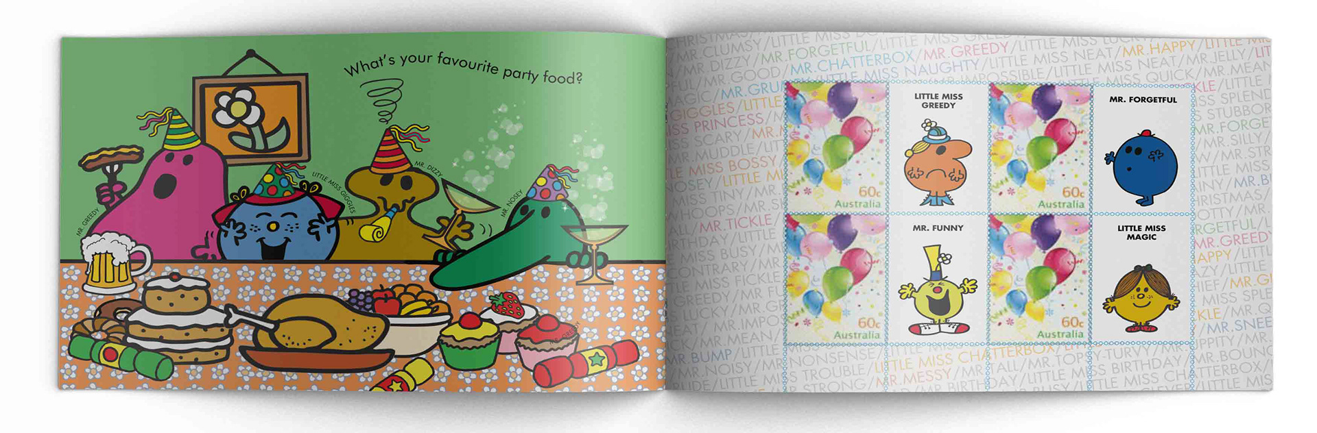 Prestige booklets are a special collectable philatelic product that contain contents relevant to the subject matter as well as uniquely configured stamps, often with a special side tab. I took this Mr Men collection from concept through to print. Working closely with the brand guidelines I had to create illustrations from existing templates, as well as from scratch. Being 'fun books' puzzles, activities and colouring pages were also created from nothing. The 4 books in the collection contain character from the Mr Men and Little Miss Range.