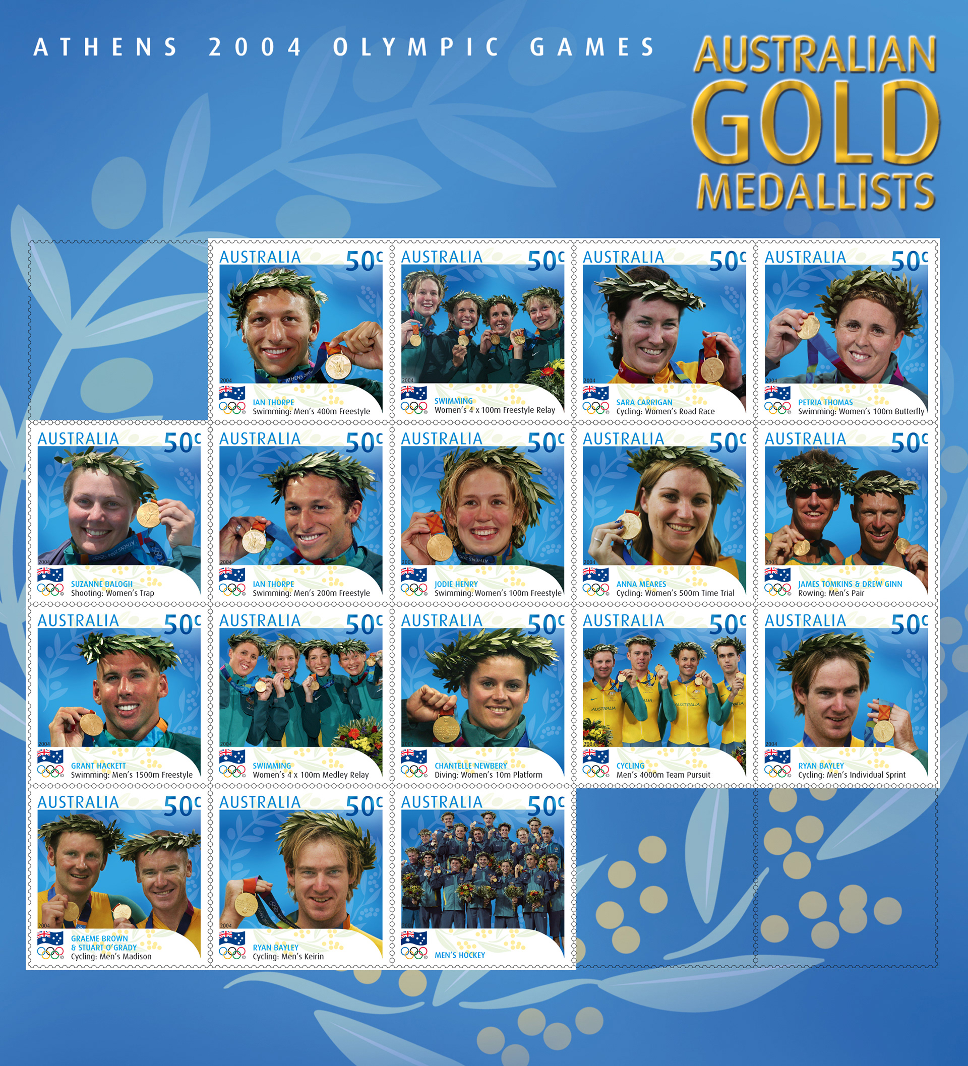 Athens 2004 Gold Medallist stamps and products - This projects was the second of an Olympic instant stamps series, whereby gold medals were won by our Athletes and stamps were designed, printed and on the shelves in retail shops throughout Australia within a few days. I designed a template and associated products prior to the event. An olive wreath was created and incorporates Australia's wattle to symbolise both countries connection during the games. During the actual event, and in conjunction with Getty Images, images of the winning athletes were downloaded, manipulated and placed into the template (by the whole design team, at very ungodly hours in the morning) and artwork was digitally sent to print production houses.