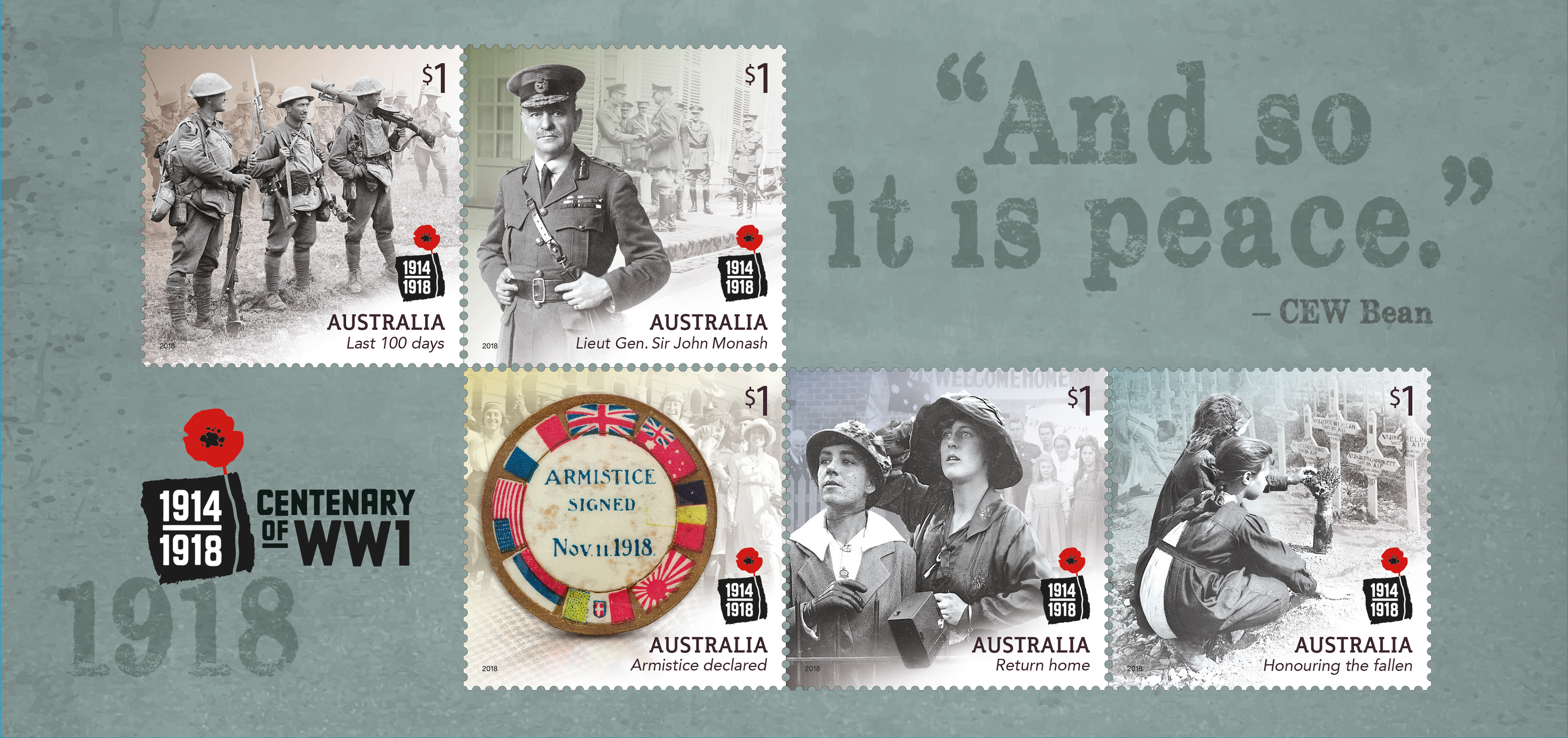 This minisheet, set of stamps and products marks the events of 1918 and is the last of a 5 year series commemorating The Great War. A slideshow was created for social media to give an overview of project.