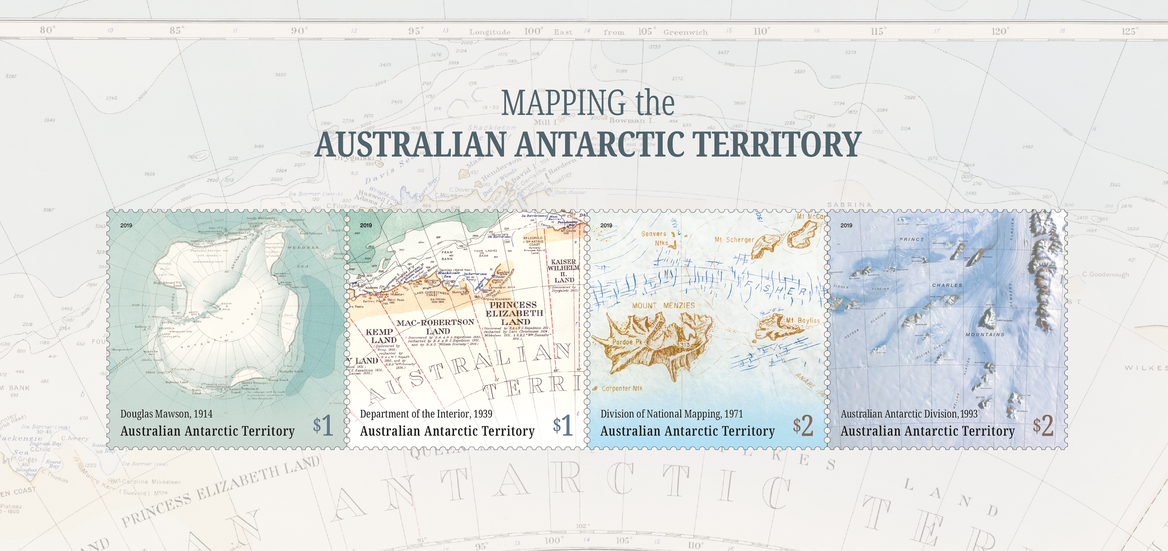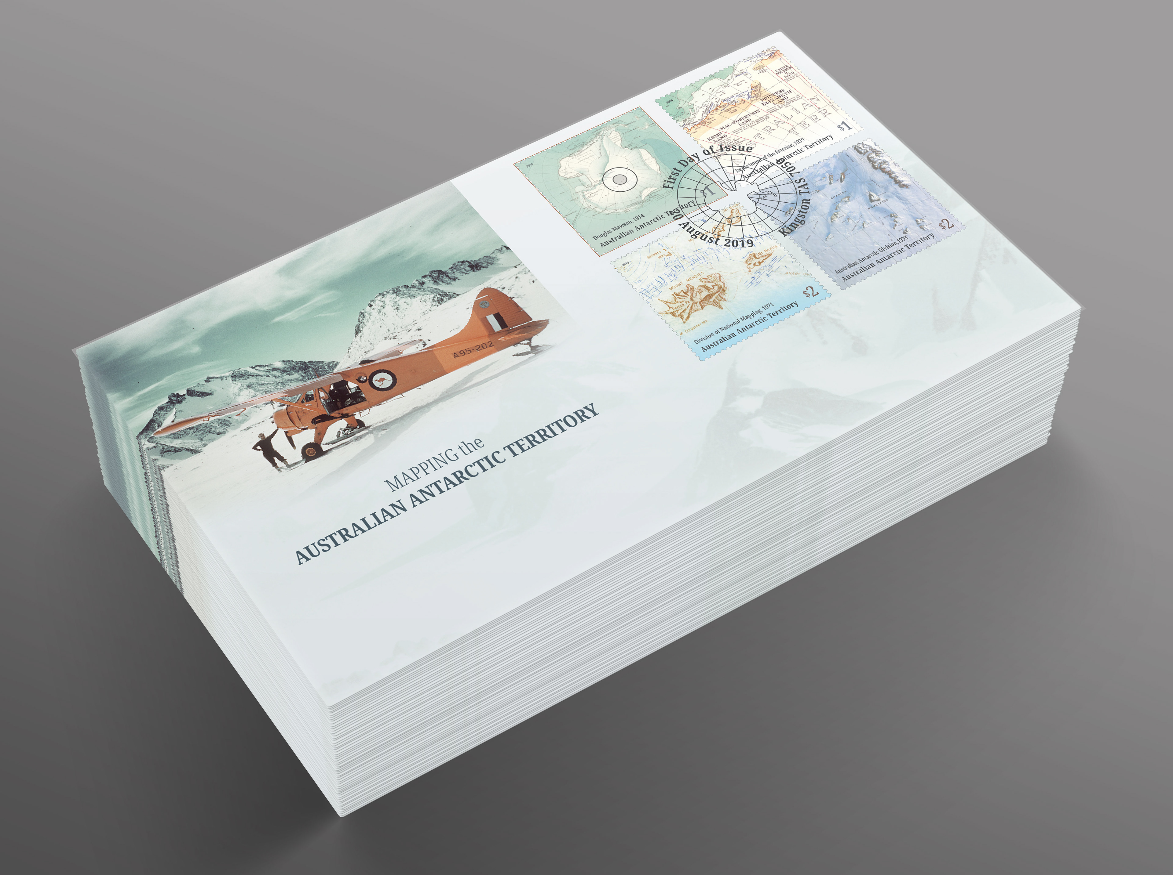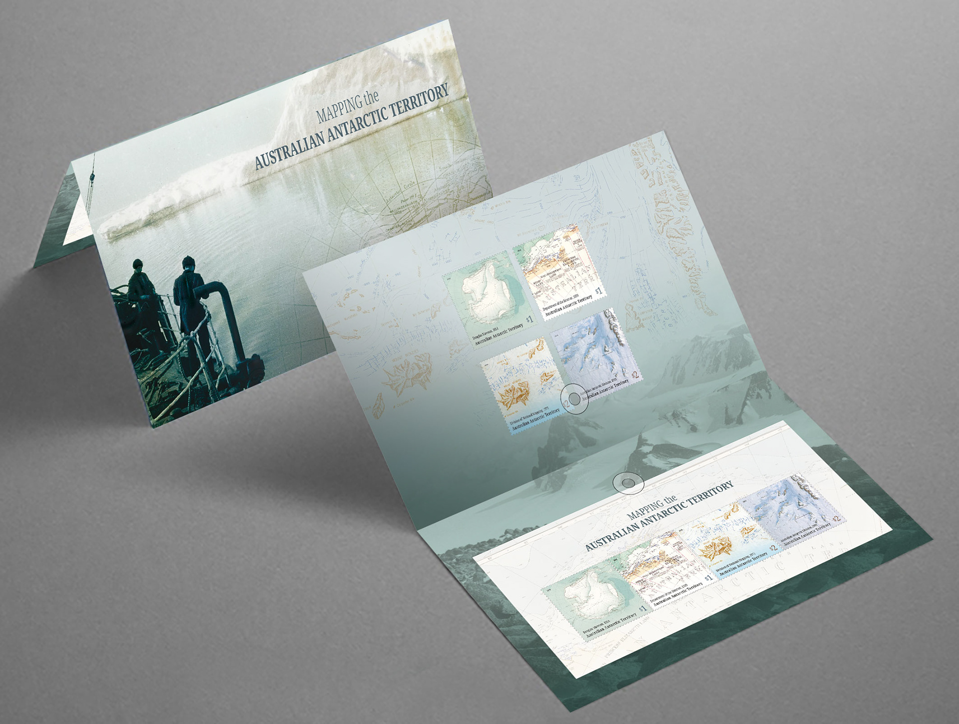 This minisheet, set of stamps and products shows the development of mapping techniques used to survey Antarctica